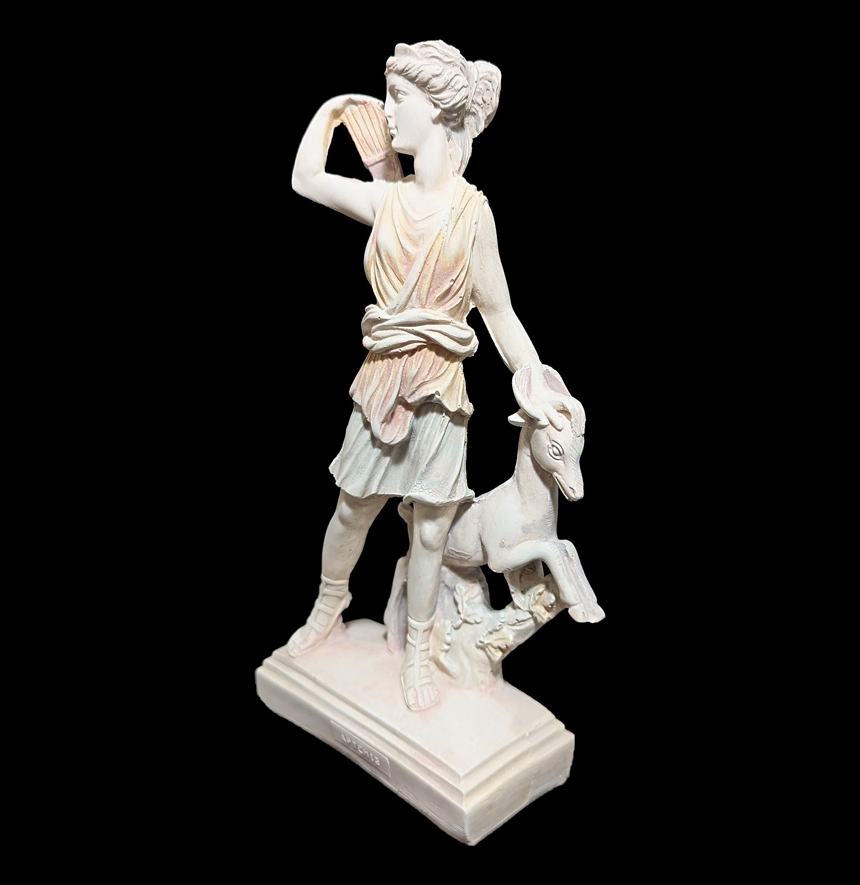 Imported from Greece, this stunning alabaster sculpture shows Artemis, the Greek goddess of the hunt, wilderness, wild animals, the Moon, and chastity. Known as the ultimate protector of nature and a symbol of strength and independence, she’s pictured with her bow and arrow, often with a deer or hunting dogs by her side, capturing the wild spirit she’s famous for. Handcrafted with amazing detail, this statue brings both grace and power into any space. Measuring 10 inches tall, 4 ¾ inches wide, and 2 ⅝ inches deep, it’s perfect for mythology fans, Greek art collectors, or anyone looking for a bold decorative piece.