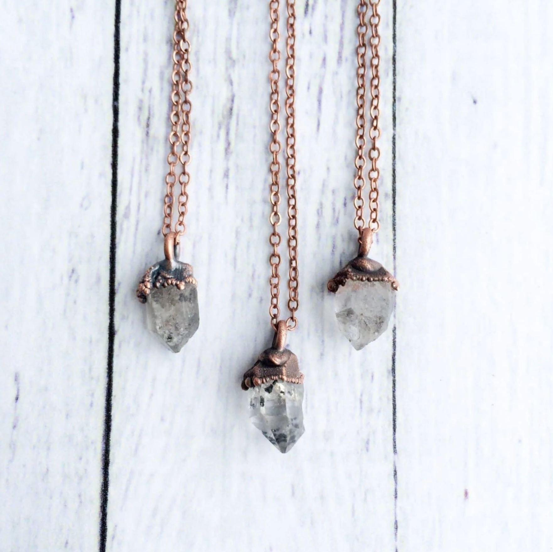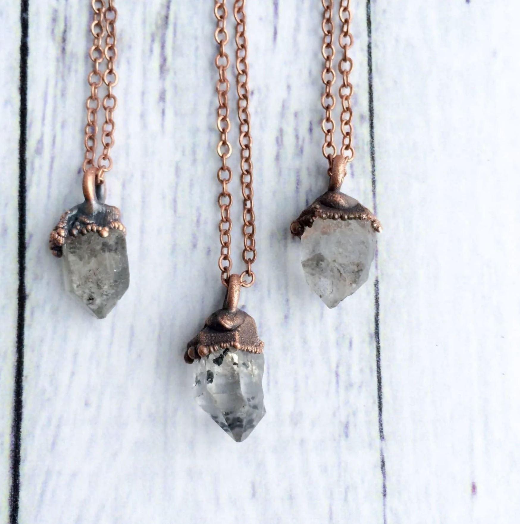 This listing is for one anthraxolite quartz crystal electroformed and strung on an 18" copper chain. Tiny carbon inclusions trapped inside the quartz crystal create black flecks and a smokey appearance.