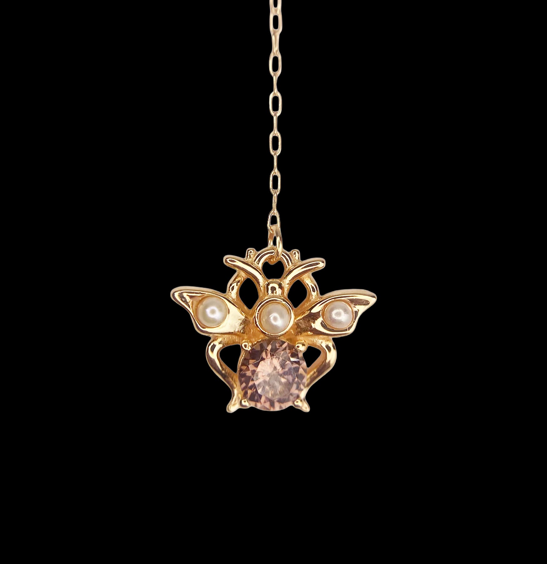 18k gold plated 925 sterling silver Black Widow pendant with hanging fly. Includes pearls with green and purple zircon stones.