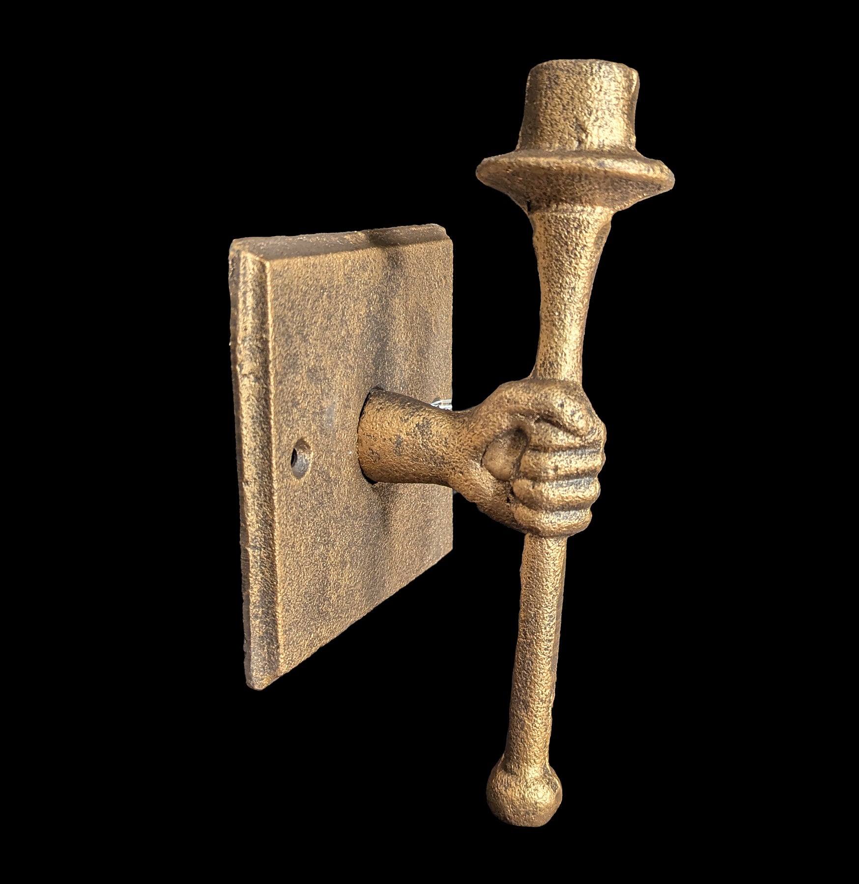 Light up your space with this set of torchbearer wall-mounted candle sconces. Made from cast iron with a rustic bronze finish, they add a timeless touch that fits almost any décor. Each sconce measures 4.5" long, 3.5" wide, and 8" high, and comes with pre-drilled holes for easy mounting with two screws
