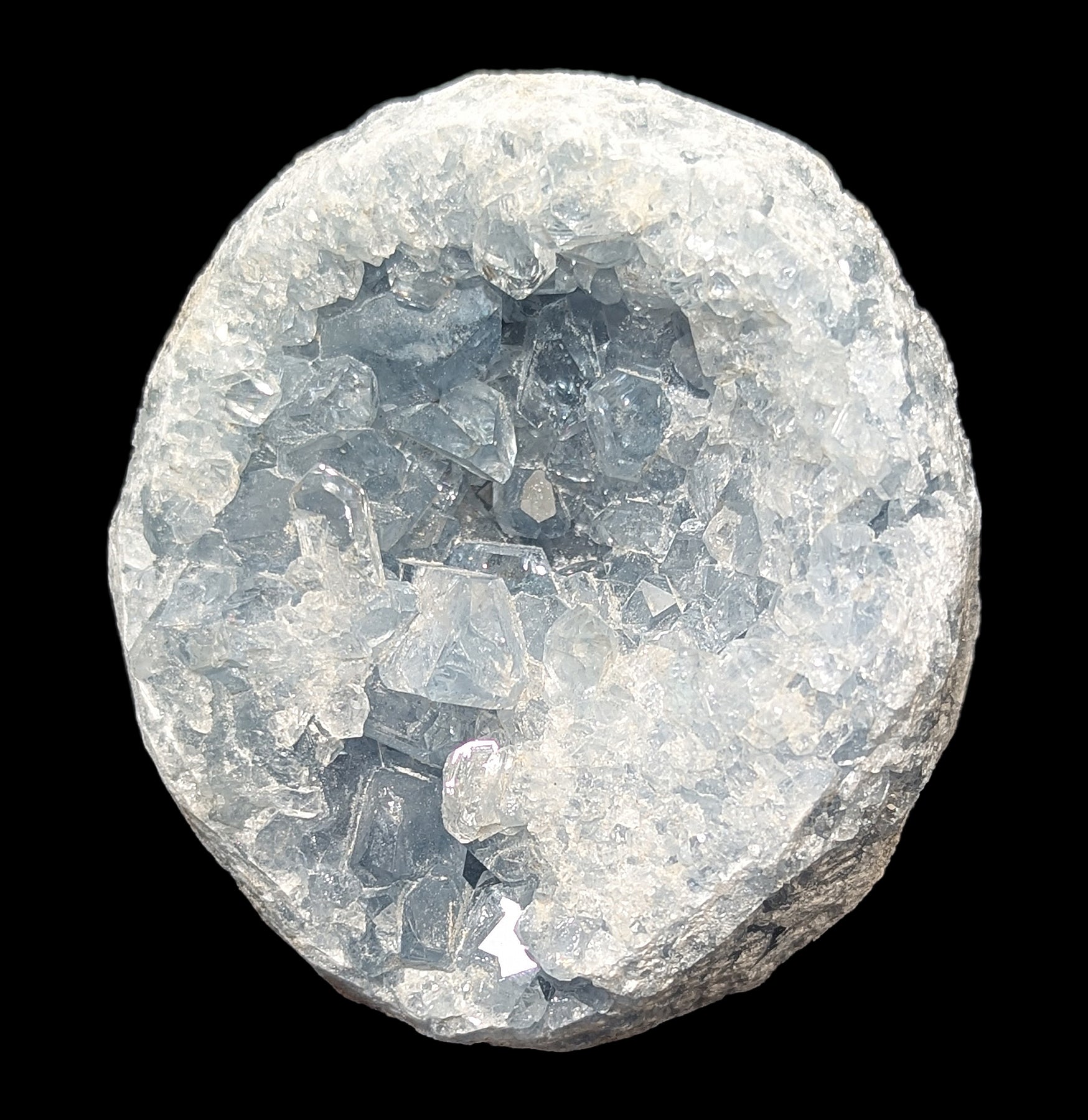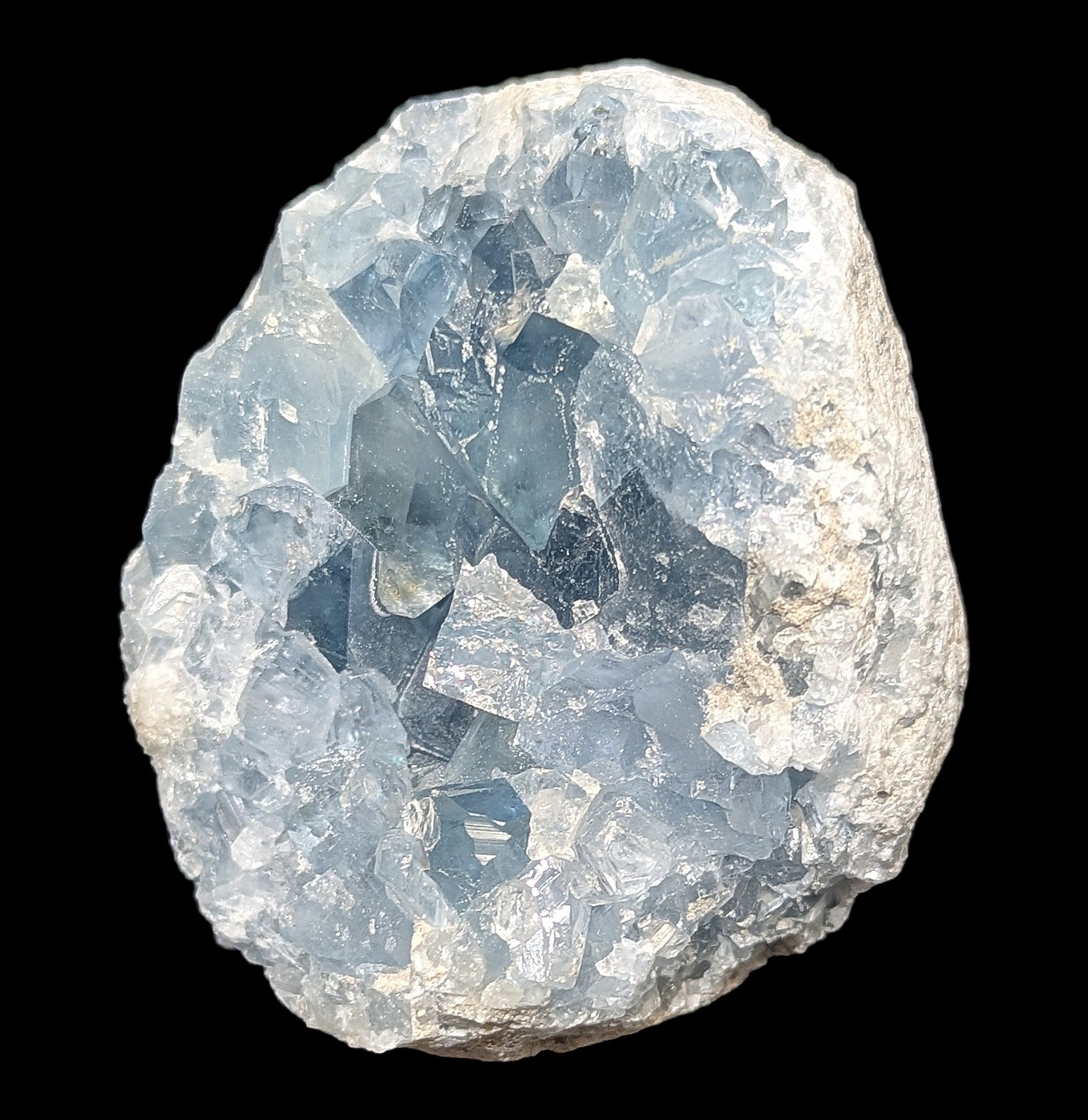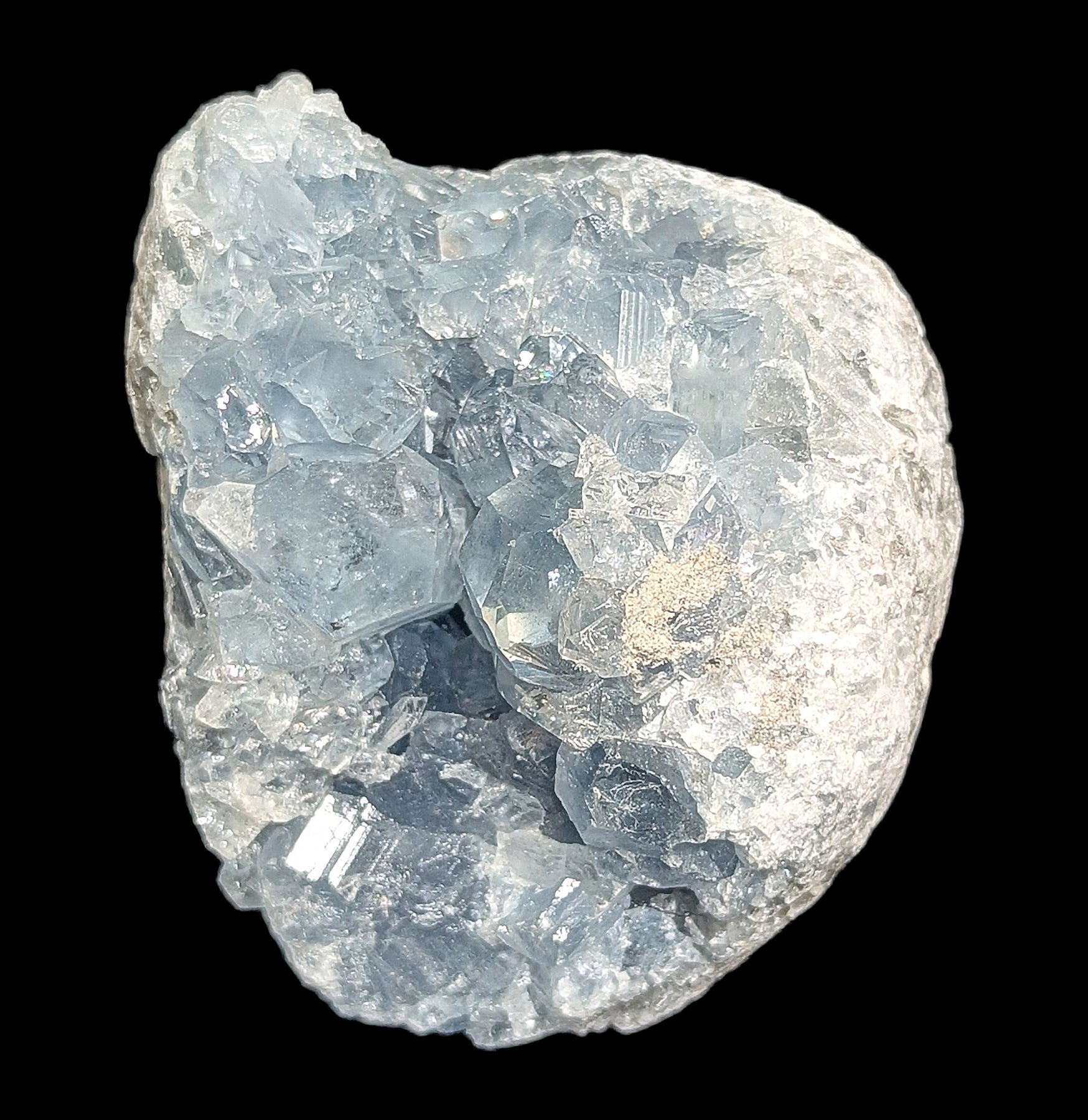 Celestite is made of strontium sulfate, and its name comes from the Latin word caelestis, meaning “celestial,” inspired by its sky-blue crystals. You’ll often find it in geodes as sparkling crystals, but it can also appear as fibrous formations in sedimentary rocks, like riverbeds, streams, and ocean floors. It often grows alongside minerals such as gypsum, anhydrite, and halite.