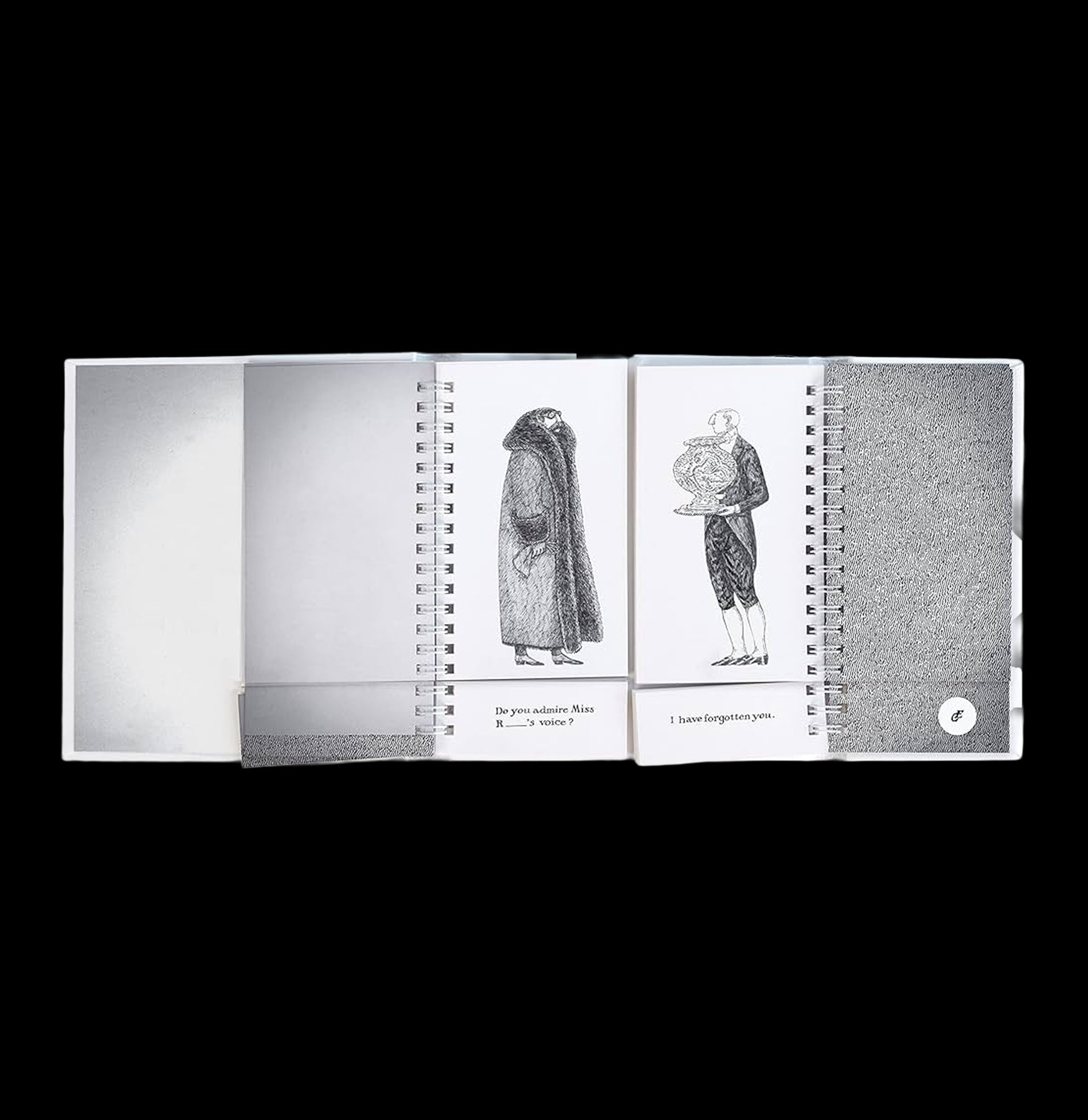 Les E ́changes Malandreux—from the brilliantly esoteric mind of Edward Gorey—was originally published in 1984, an interactive flip book that has the potential to create thousands of different scenes (65,536 to be exact). This book is meant to be read by turning the upper and lower pages independently to create unique interactions between the droll, eccentric characters. Reprinted here in four sections—two for Gorey’s drawings at the top and two for his captions at the bottom—are 32 mix-and-match personas and bemusing remarks. New trysts, outrageous dynamics, and unlikely conversations will arise each time you crack the spine.