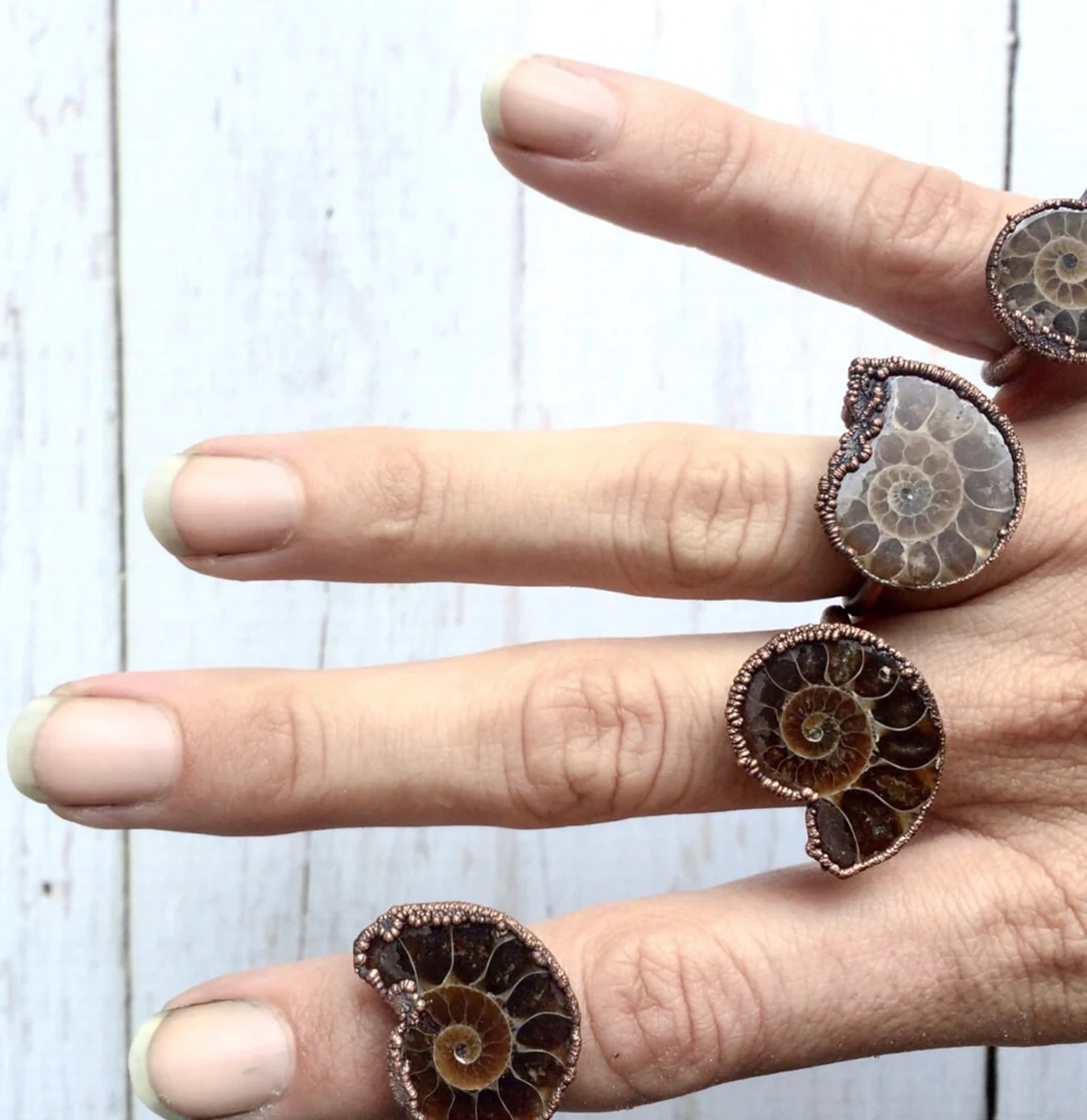 This ammonite fossil electroformed to a hand-hammered 12 gauge recycled copper ring. These ammonite fossils are 65 million years old or older, as they were part of the dinosaur extinction. Ammonites are one of the most abundant fossils found today.