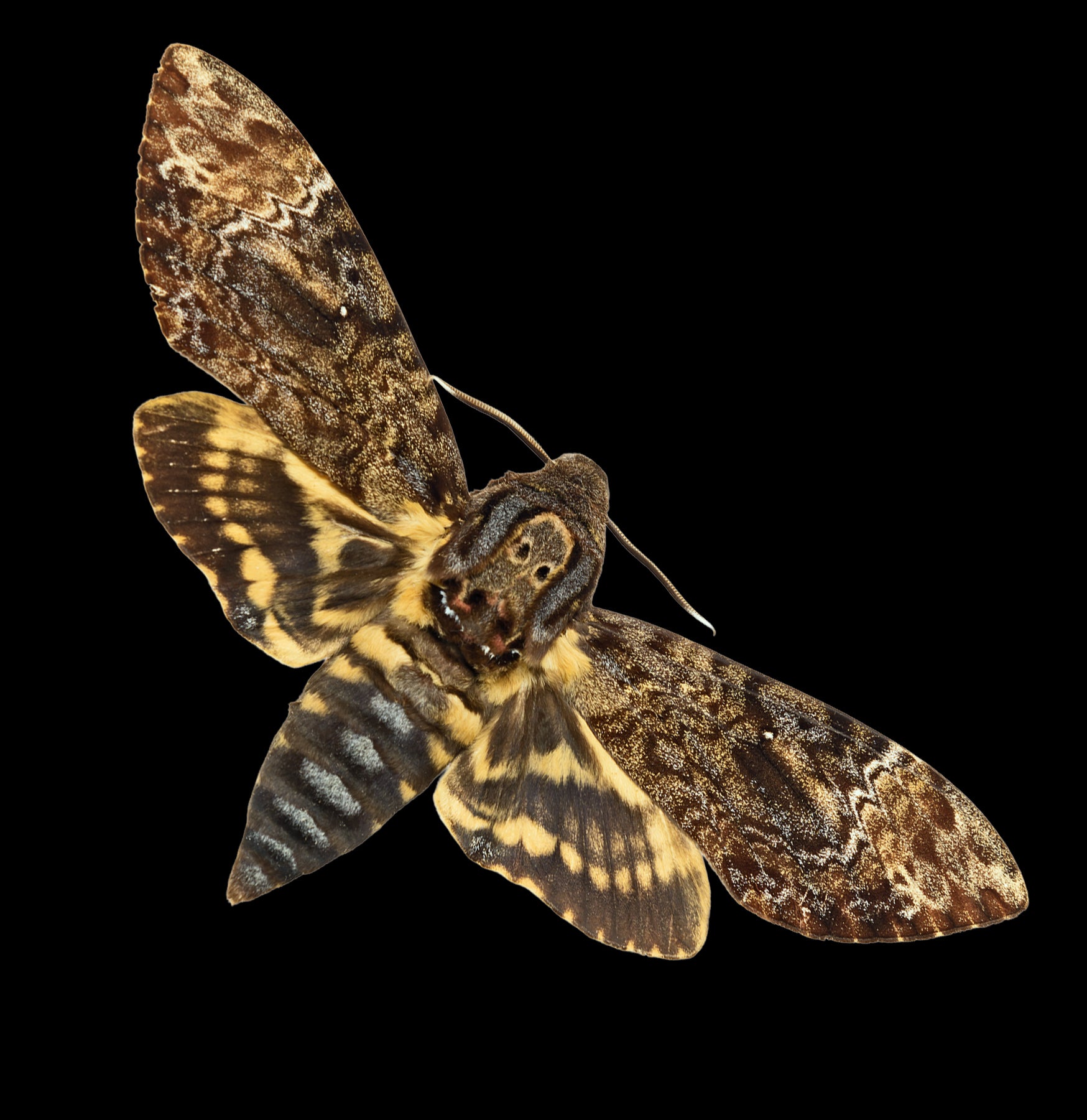 A creature steeped in mystery, folklore, and myth, the Death’s-head moth has long captured imaginations. In Europe, it was often called the “harbinger of death,” and seeing one was thought to be a sign of ill fortune. In Poland, it earned the nickname the “wandering bird of death,” with its squeak likened to the moaning of a grief-stricken child. Charming, right? In France, it was even believed that dust from the moth’s wings could cause blindness. Makes total sense to us. Overall, this moth has some truly heartwarming, “Chicken Soup for the Soul” style stories surrounding it.