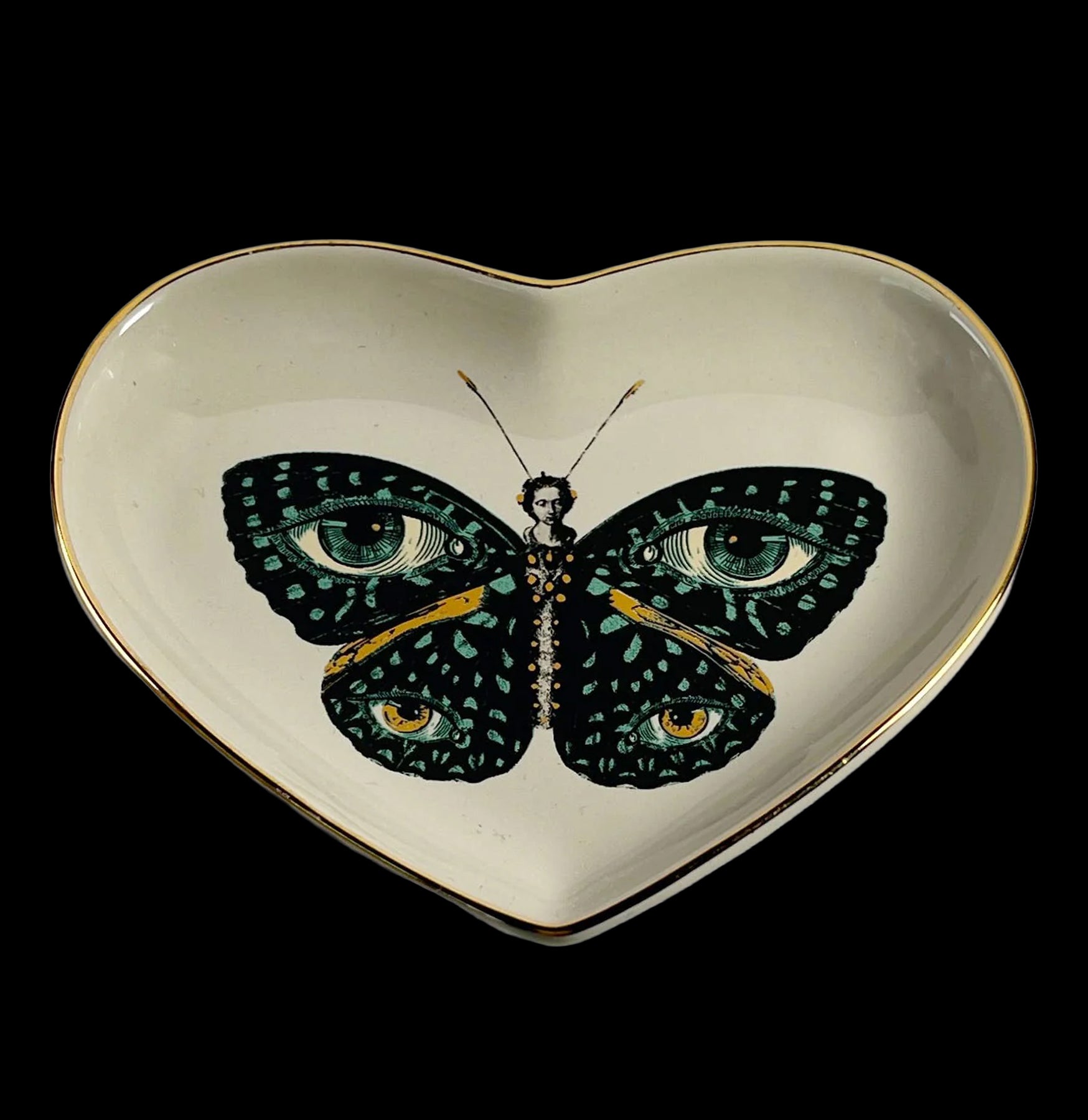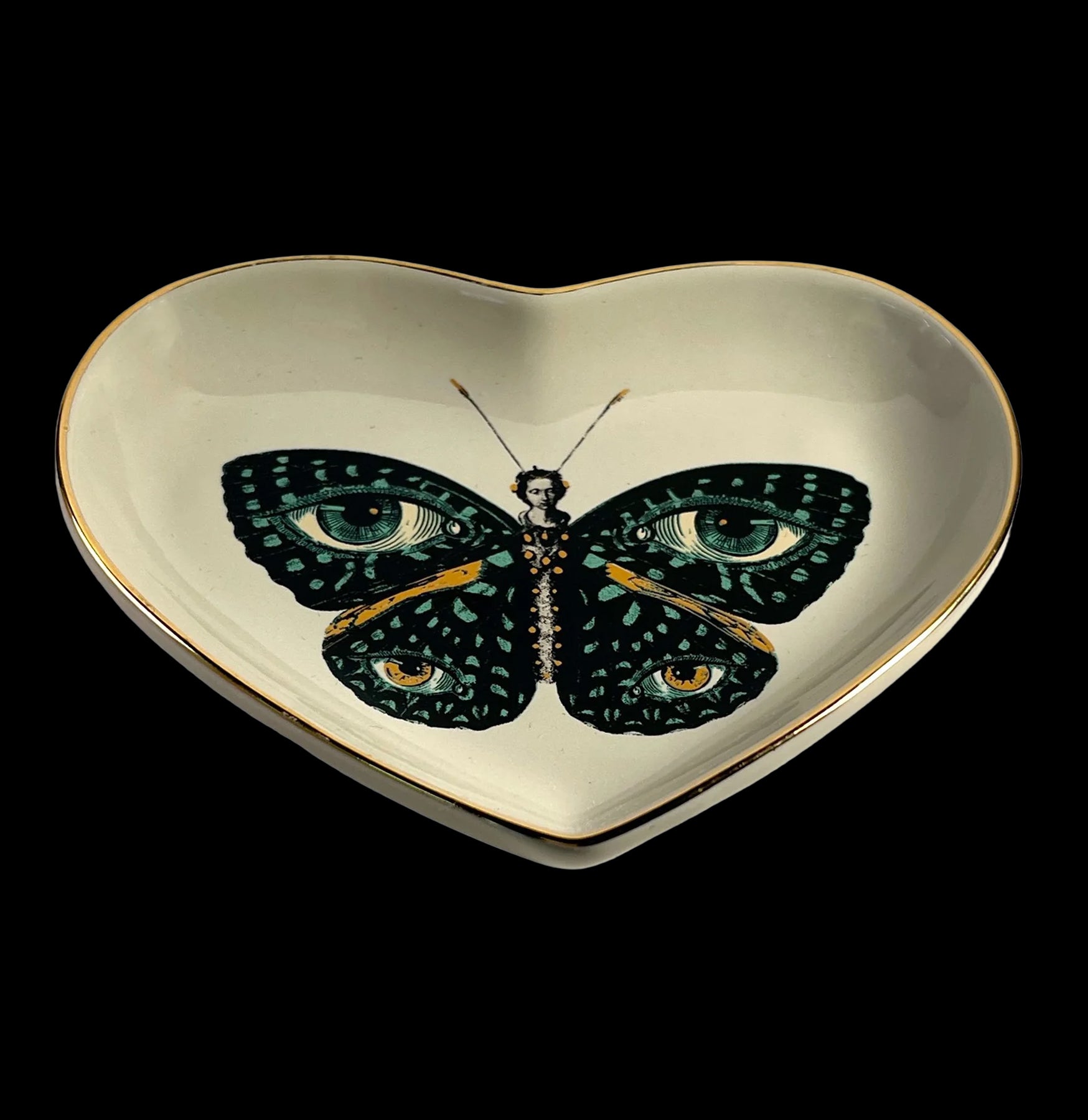 Measuring a delightful 5" across, this ceramic heart dish is not just a vessel; it's a treasure box for your cherished items. Promising to cradle your possessions, Madame Butterfly ensures that your memories and trinkets are held with the same care as her intricate design.