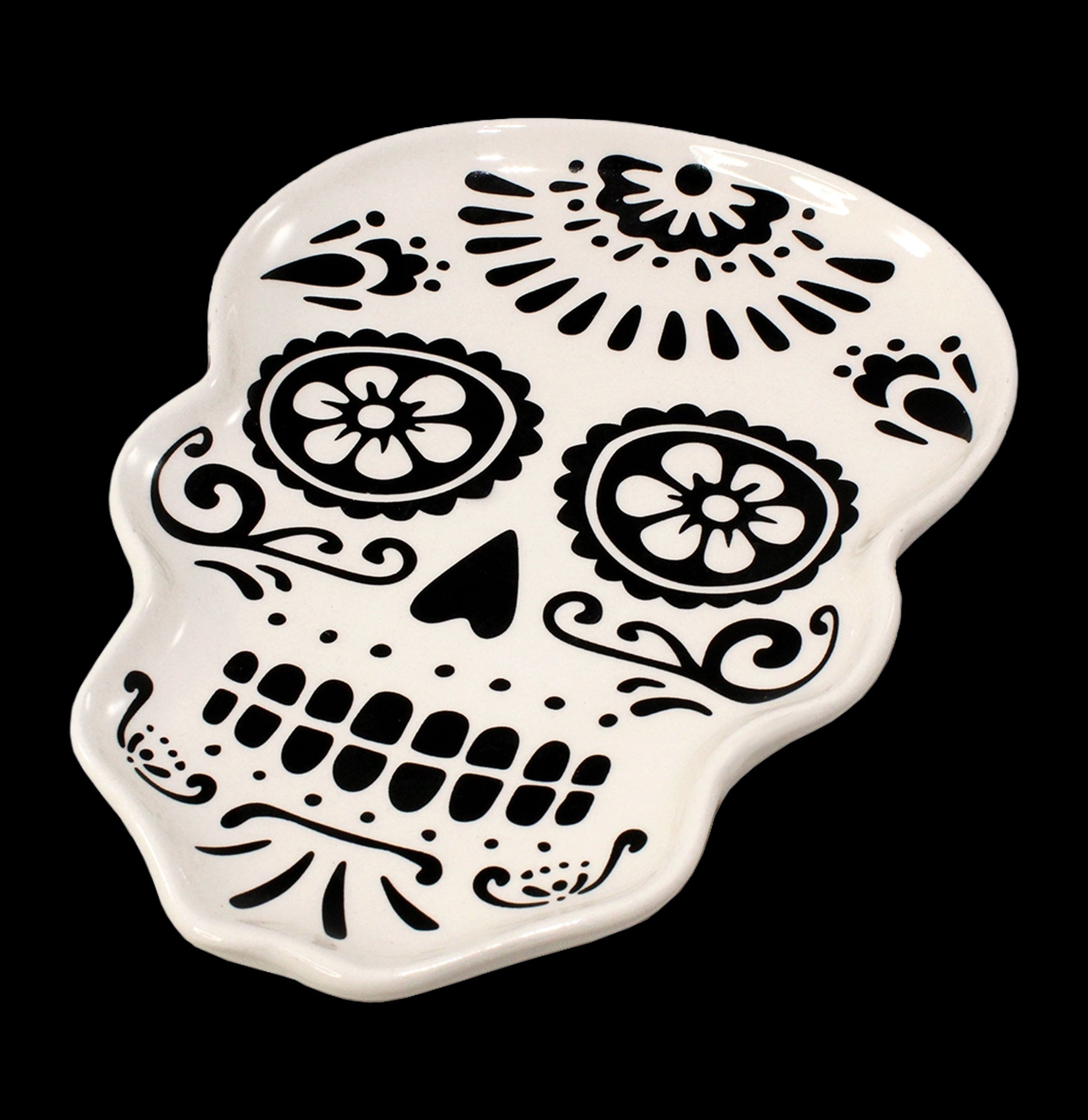 his sugar skull ceramic tray in antique white and black is a fun and stylish way to corral your small stuff. Perfect for jewelry, keys, or even a little candle, it adds a touch of Day of the Dead flair to any space.