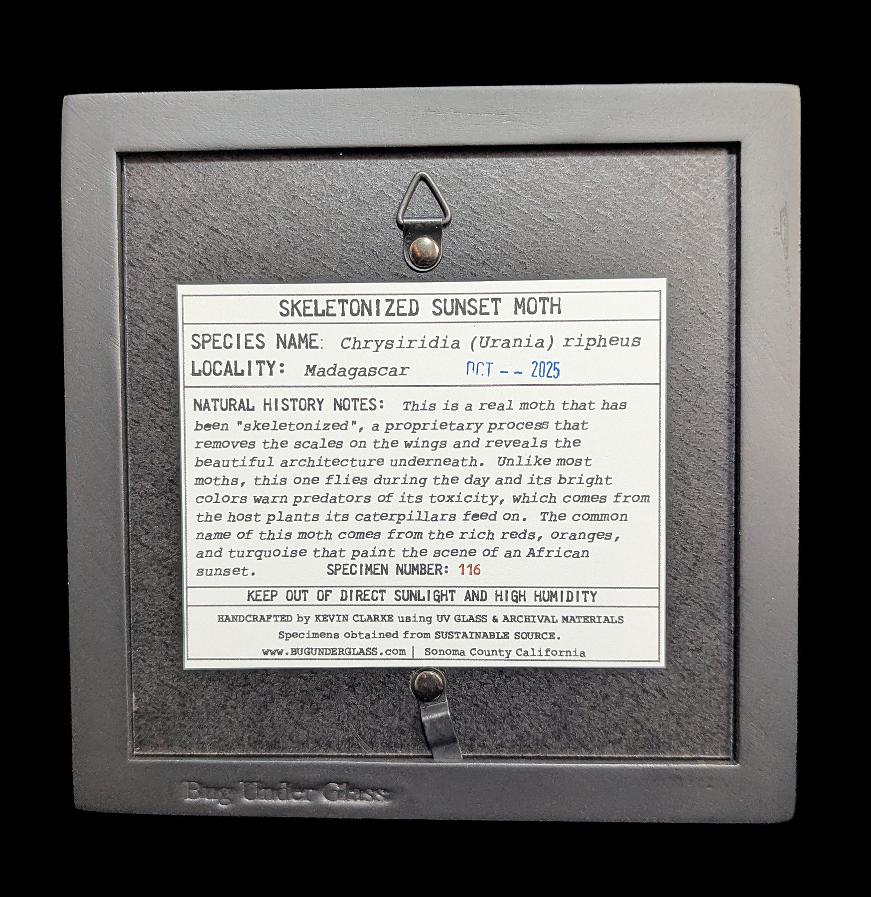 At Paxton Gate, we offer a diverse array of insects sourced from various suppliers, artists, and vendors. Rest assured, all our insects are sustainably sourced through ethical practices. In most instances, they are either sustainably harvested following stringent guidelines or bred on conservation farms.