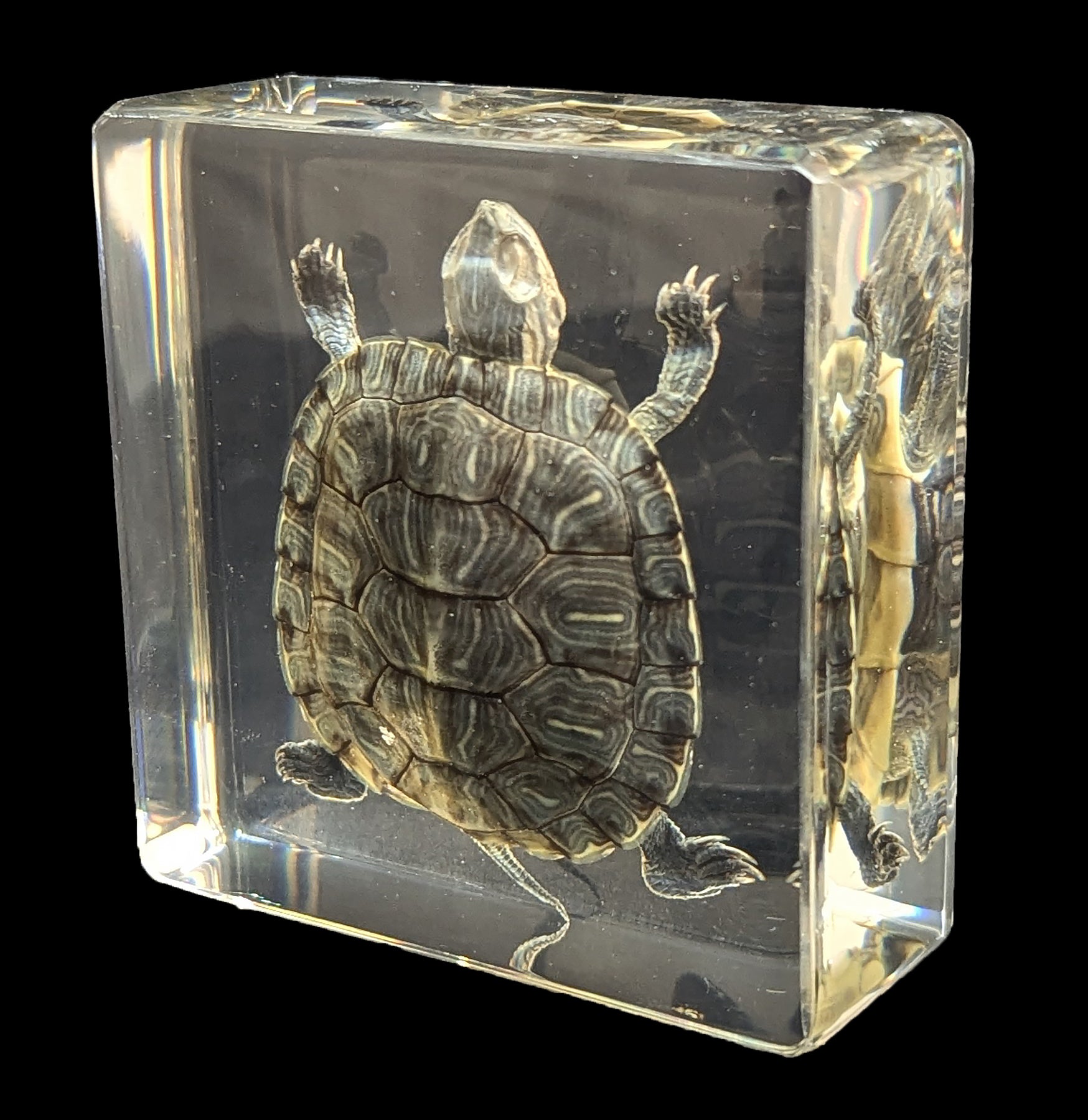 Turtles are weird. They don't have ears. Their shells are evolved ribcages. They live super long lives. Ponder these and other reptilian quandaries with this acrylic encased turtle.