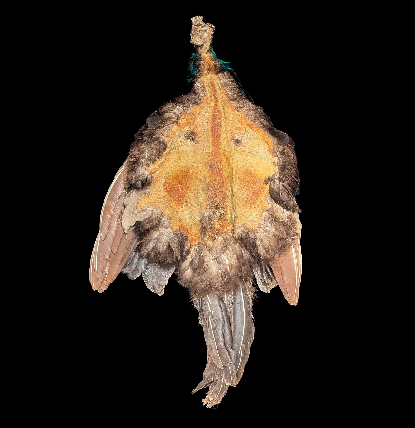 This specimen is a 2-year-old male Blue Indy peacock skin that has been preserved with borax. It measures approximately 39 inches long and 20 inches wide.